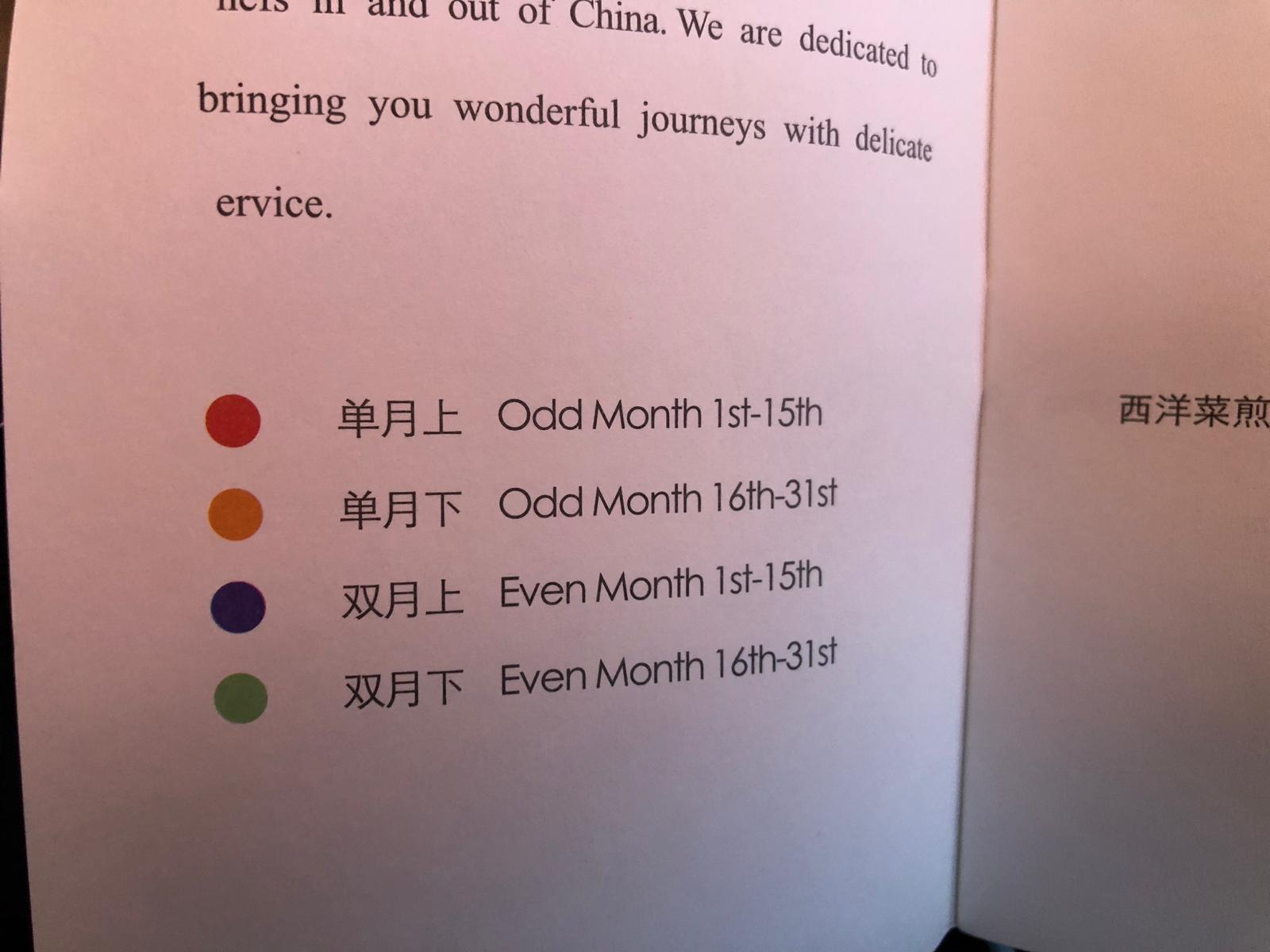 The welcome drink was champagne, orange juice, or water. I selected the champagne. This time spherical, the menus have been positioned at our seats. I took a look by way of, and from the relevant menu for our flight. China Eastern has the behavior of printing a single menu that may final them for a lot of, many months. If you watch 3:30 of my video you will note that the menu is color coded – Red for Odd month 1st to fifteenth, Orange for Odd month sixteenth to thirty first, Blue for Even month 1st to fifteenth and Green for even month sixteenth to thirty first.