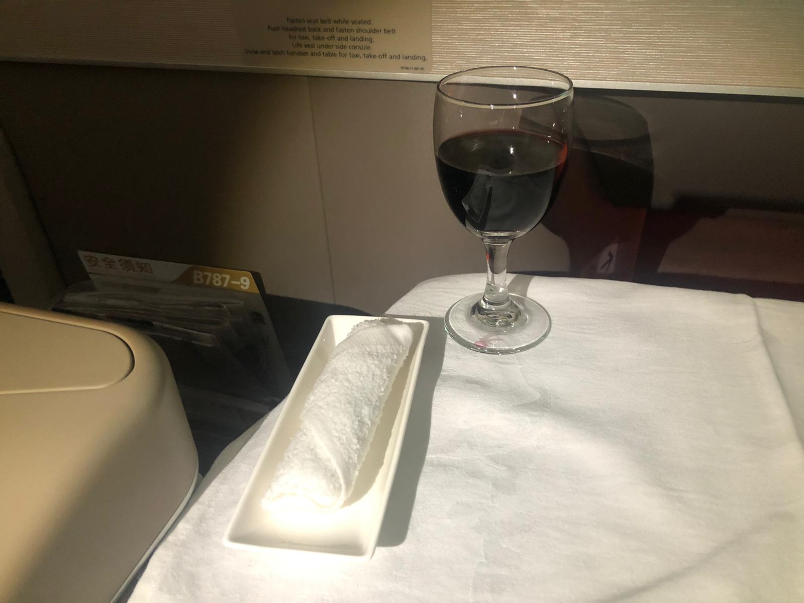 My tray desk was prepared for dinner service. They gave me the purple wine first.