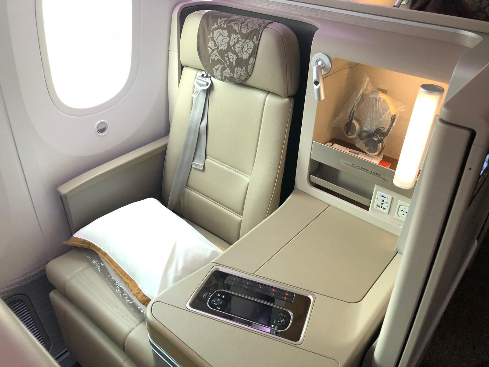 A short time later, we boarded the plane. Finally, we had been on our manner! This was our first ever flight on China Eastern. This Boeing 787-900 Dreamliner was nearly model new [Serial Number B-209N]. The enterprise cabin was attractive, it was in a 1-2-1 staggered formation. My spouse sat in entrance of Seat 7L, whereas I used to be in seat 8L (image beneath). Take notice that the window seats had been alternate, meaning a number of the window seats (like 8L) had been really window seats, however others had been barely away from the window (like 7L and 9L). Reason was that they wanted adequate area to permit the seat to be deployed right into a flat mattress. If you watch the video beneath from the 1 minute mark, you possibly can see the staggered formation – 6L, 7L, 8L. The Business class begins with row 6. In entrance of row 6 known as Row 1, and that was the First class seating. I did not see anyone seated in ‘First class’ although.