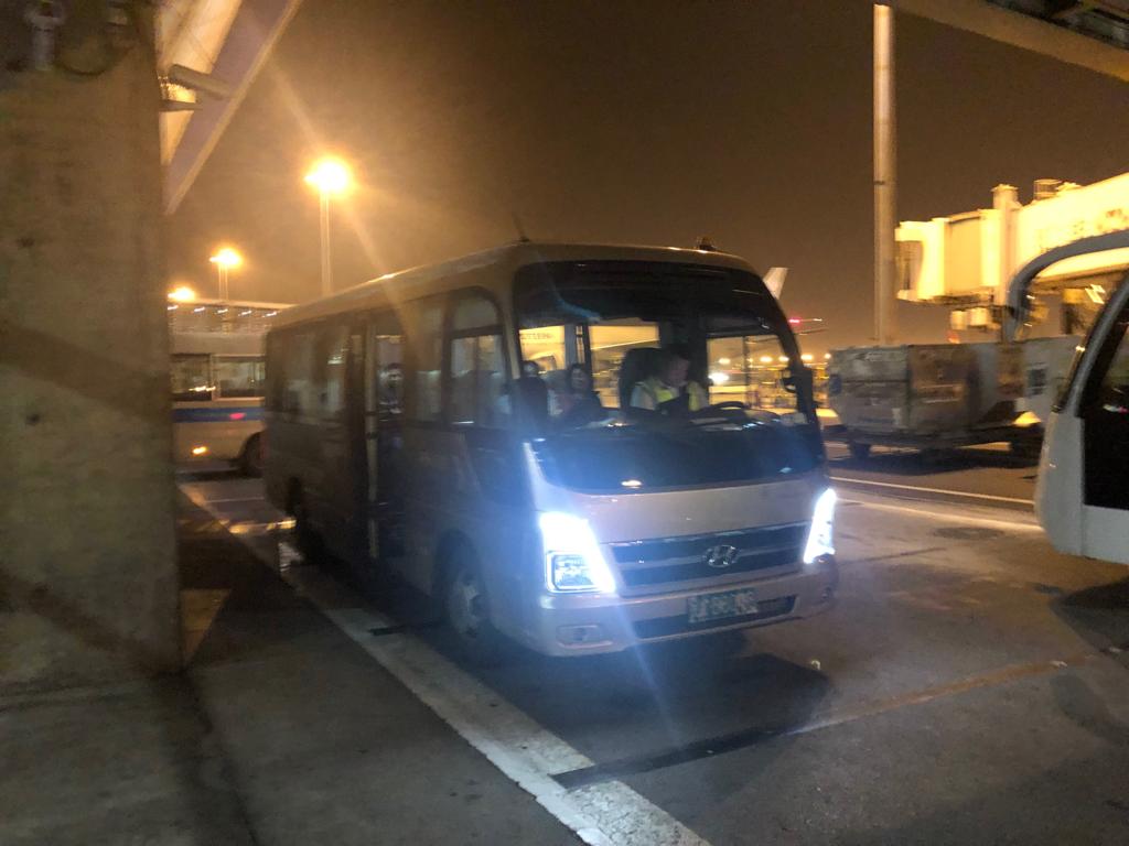 When you get to the bus bay, board the small bus (sufficient seats for all) and never the large one. Since all of us had seats, the bus trip to the aircraft can be comfy.